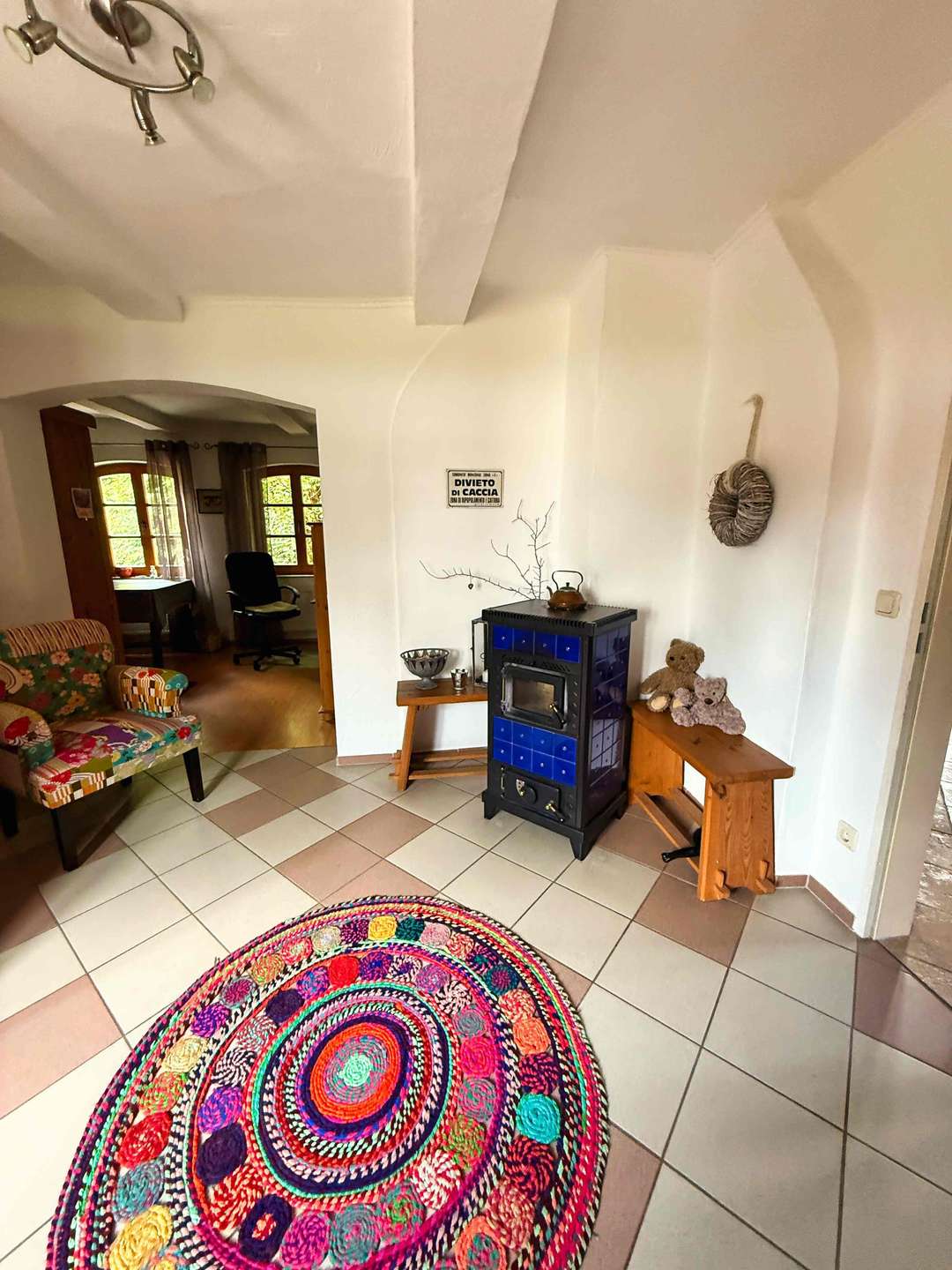 Das Wohnzimmer wird durch einen erst kürzlich eingebauten Kaminofen ergänzt, der nicht nur wohlige Wärme spendet, sondern auch an kalten Tagen für eine besonders gemütliche Atmosphäre sorgt.