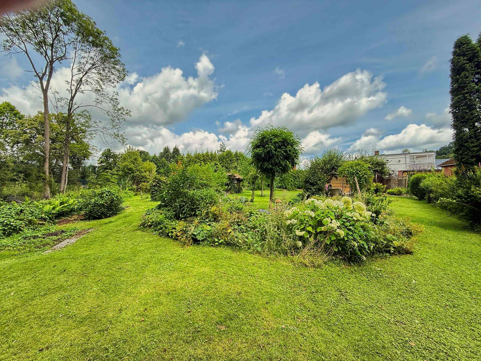 Das rund 1.800 m² große Grundstück ist ein absolutes Highlight: liebevoll bepflanzt, hervorragend gepflegt und durchzogen von kleinen Wegen, lauschigen Rückzugsorten und verschiedenen Sitzplätzen. Ob beim Frühstück in der Morgensonne oder beim Abendrot am plätschernden Bach – dieser Garten ist mehr als ein Außenbereich: Er ist ein Ort zum Leben, Durchatmen und Genießen.