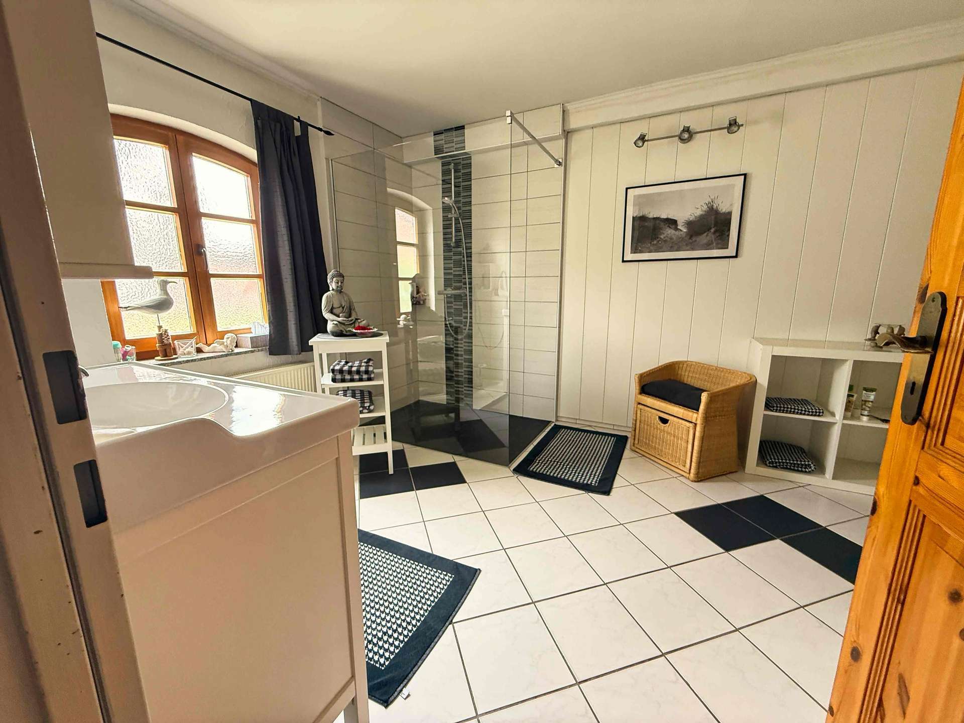 Der Umbau des ehemaligen Stalls erweitert das Haus sinnvoll und bietet zusätzliche Wohn- und Nutzflächen. Neben einem hellen Gästezimmer und einem Hauswirtschaftsraum mit direktem Zugang in den Garten erwartet Sie hier ein Wannenbad, ein separates Gäste-WC – und als besonderes Highlight: eine hauseigene Sauna. Ob nach einem langen Tag oder an kalten Winterabenden – hier lässt sich Wellness ganz privat genießen.