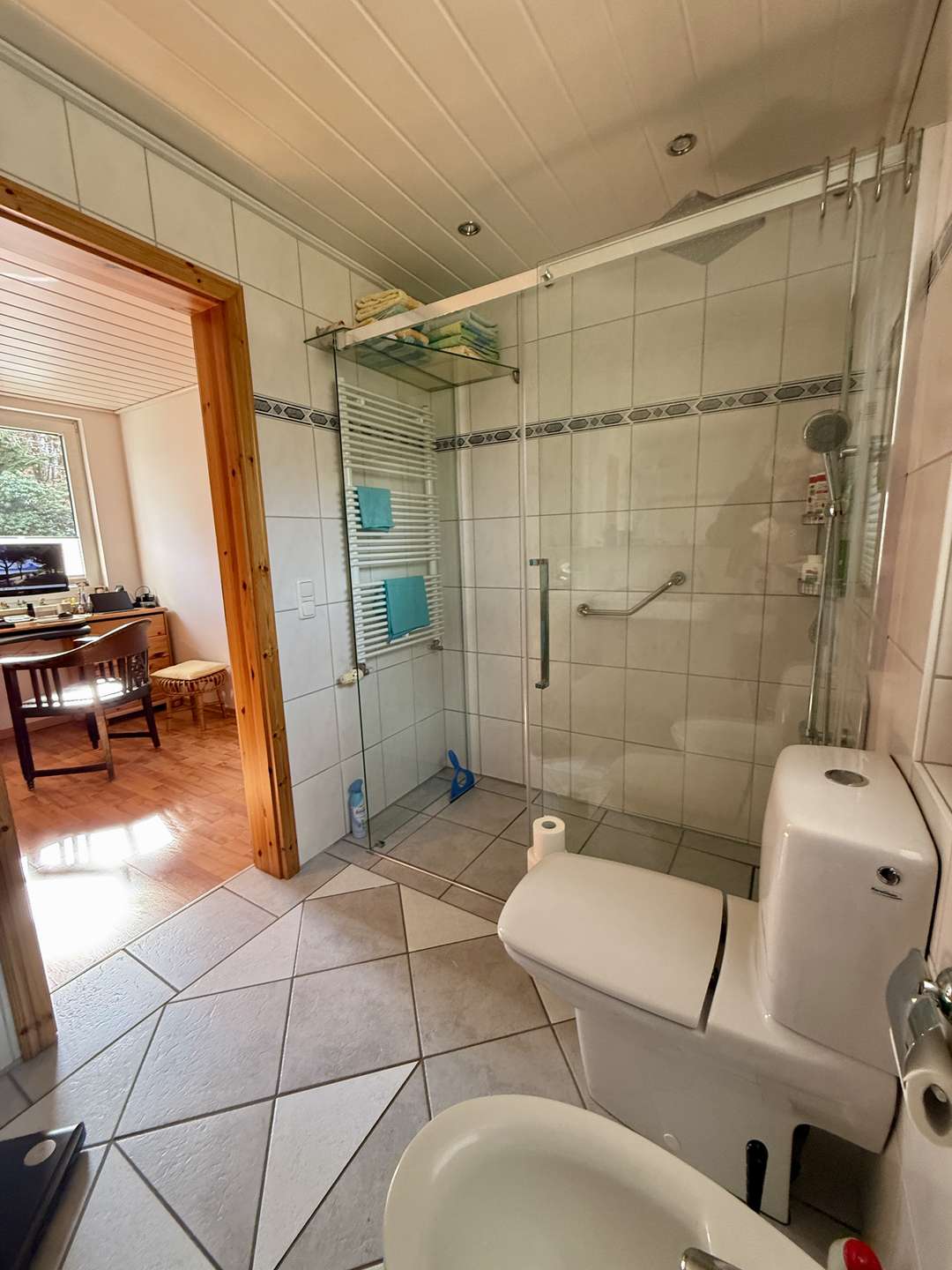 Der Anbau beherbergt ein ruhiges Schlafzimmer, ein barrierefreies Duschbad mit Fußbodenheizung sowie ein separates Büro – ideal für konzentriertes Arbeiten in inspirierender Umgebung.